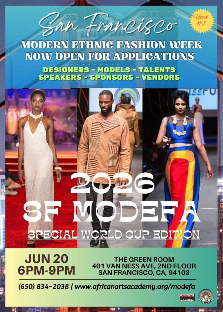 MODEFA SF (Modern Ethnic Fashion Week San Francisco) is a signature program of the African Arts Academy, dedicated to advancing arts, culture, and craftsmanship rooted in Africa and the African Diaspora. The Academy serves San Francisco residents and global audiences through initiatives grounded in cultural diversity, sustainability, innovation, and social justice.